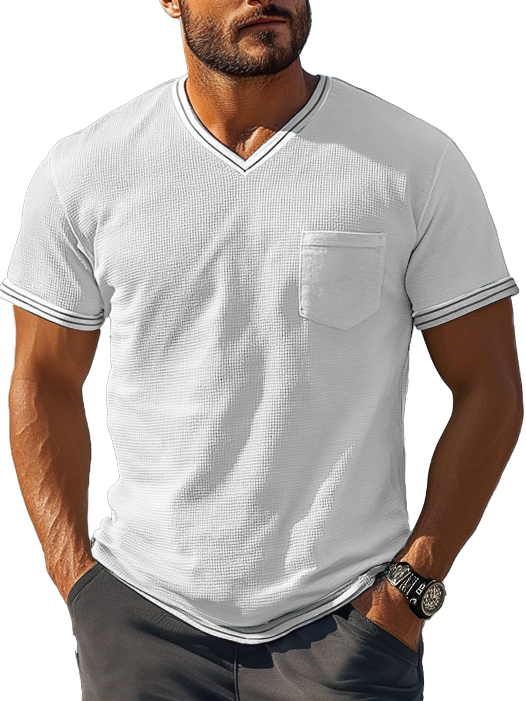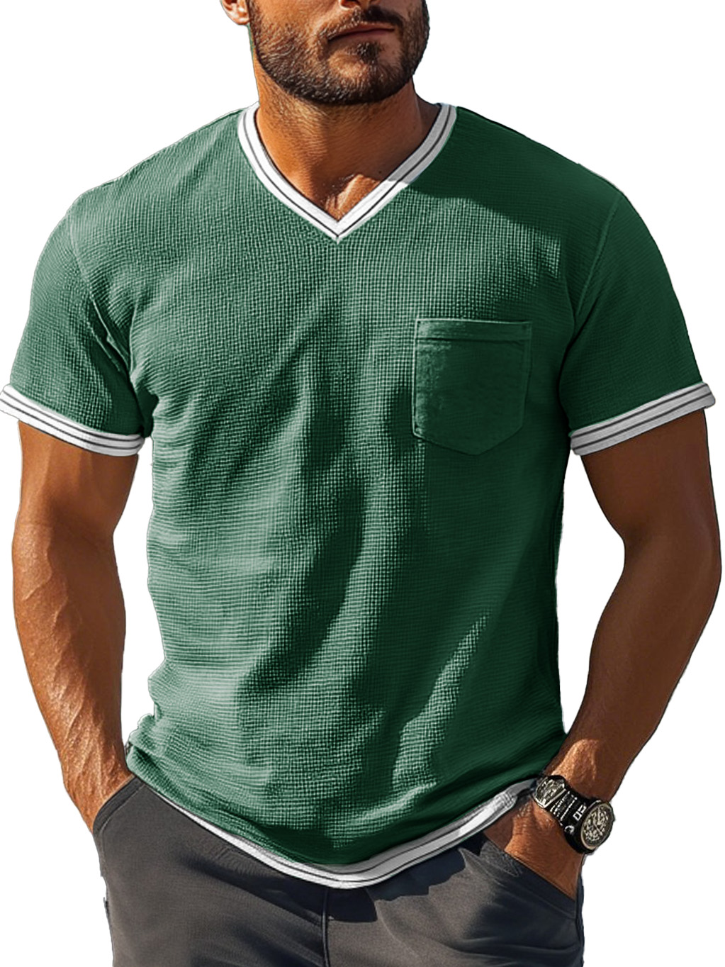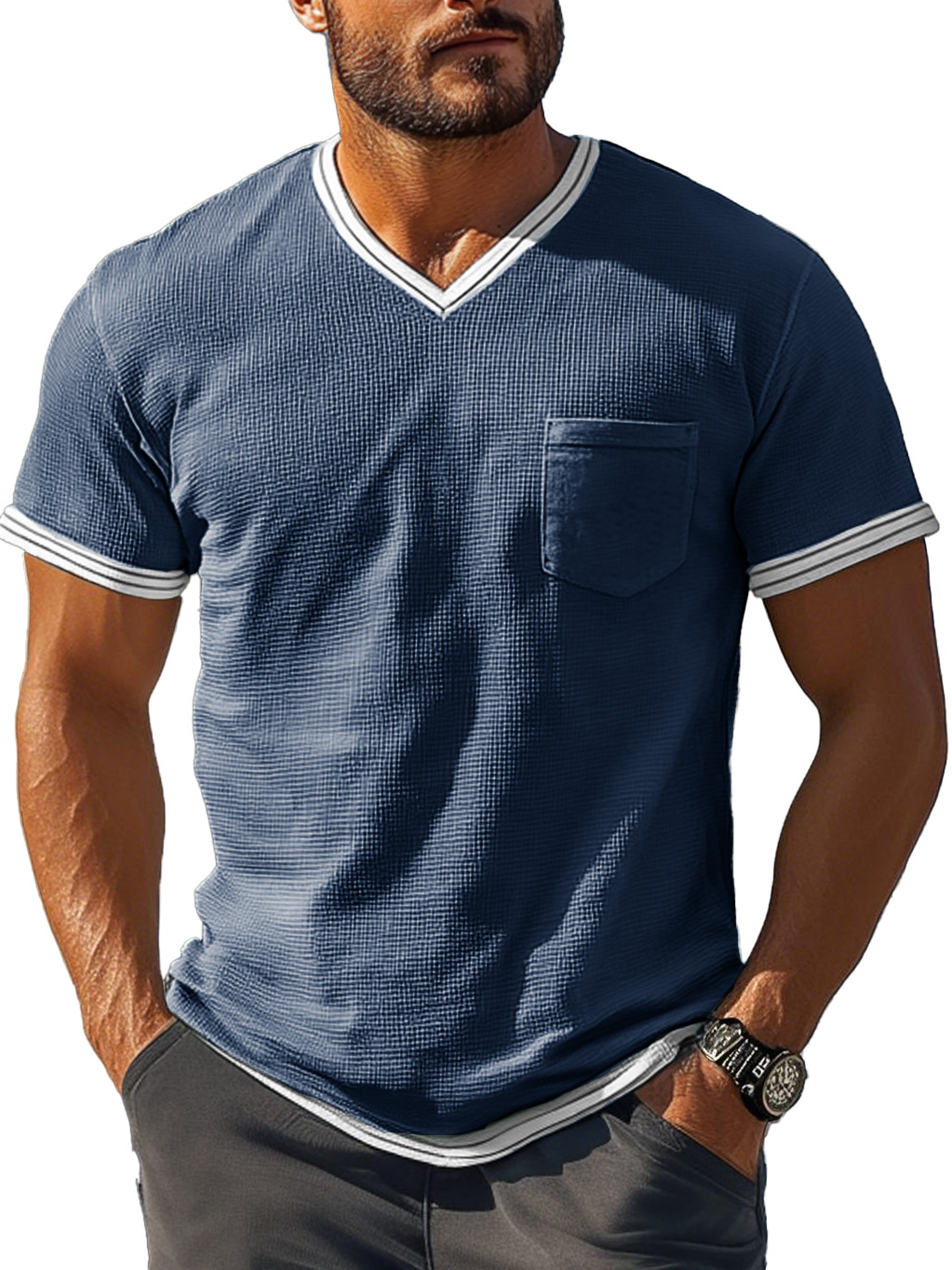 Men's Fashion Retro Patchwork Textured Fabric V-neck Short-sleeved T-shirt